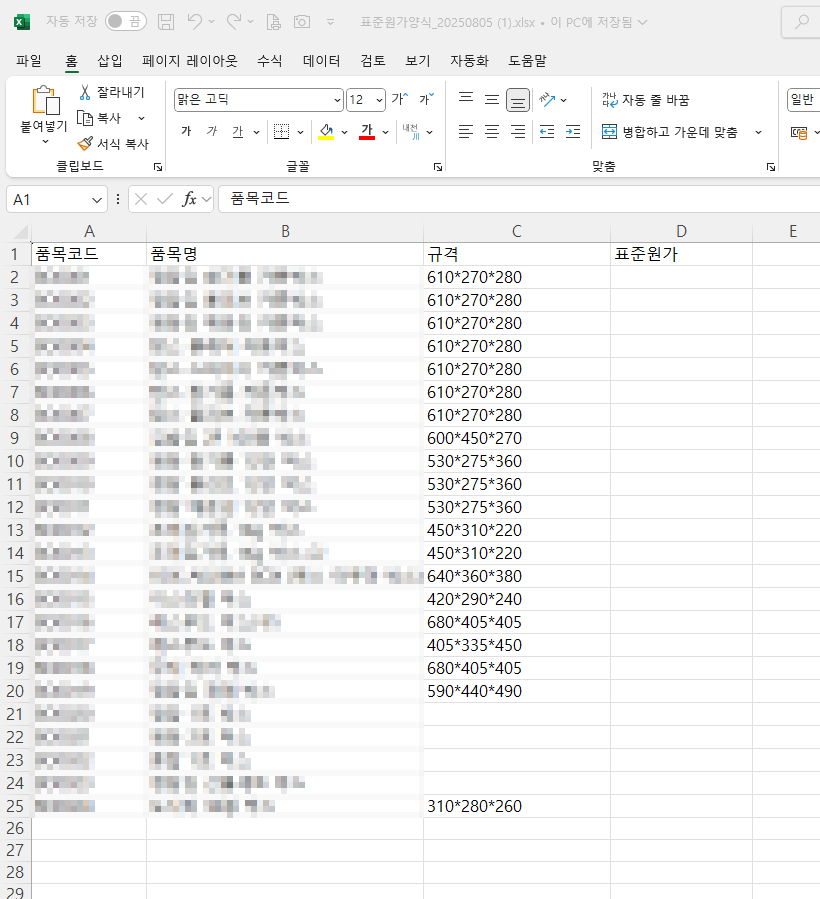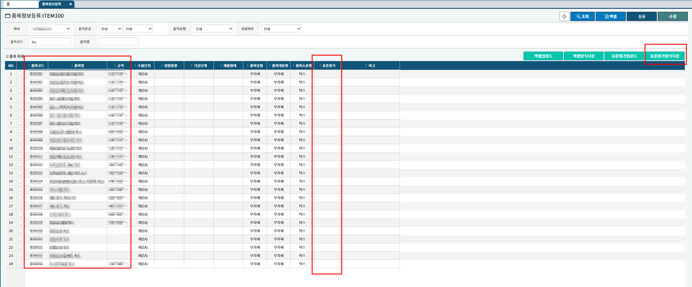 다운로드 되는 컬럼도 품목코드, 품목명, 규격, 표준원가만 다운로드하는 방법
